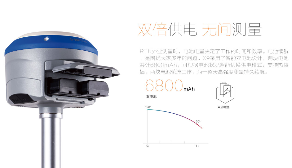 RTK模式12小時(shí),可外接直流電,雙電池電源自動切換
