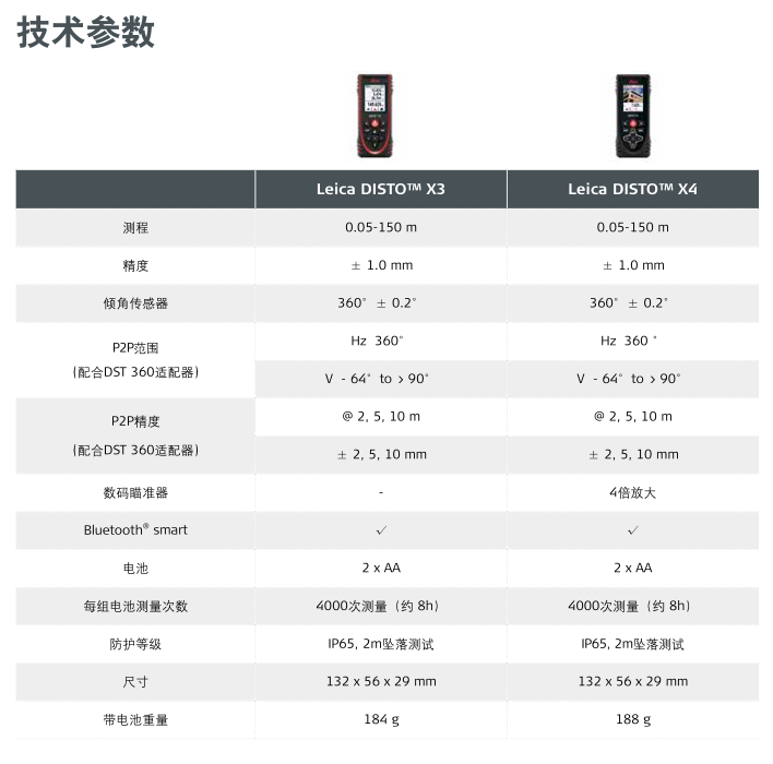 - 全新X3 X4作為全新一代Disto X-系列手持激光測距儀,在繼承了徠卡Disto的眾多優(yōu)點之外,大量融入現(xiàn)在技術與元素。Disto X3 X4專為惡劣的環(huán)境設計,帶給您耳目一新的豐富功能與測量體驗。